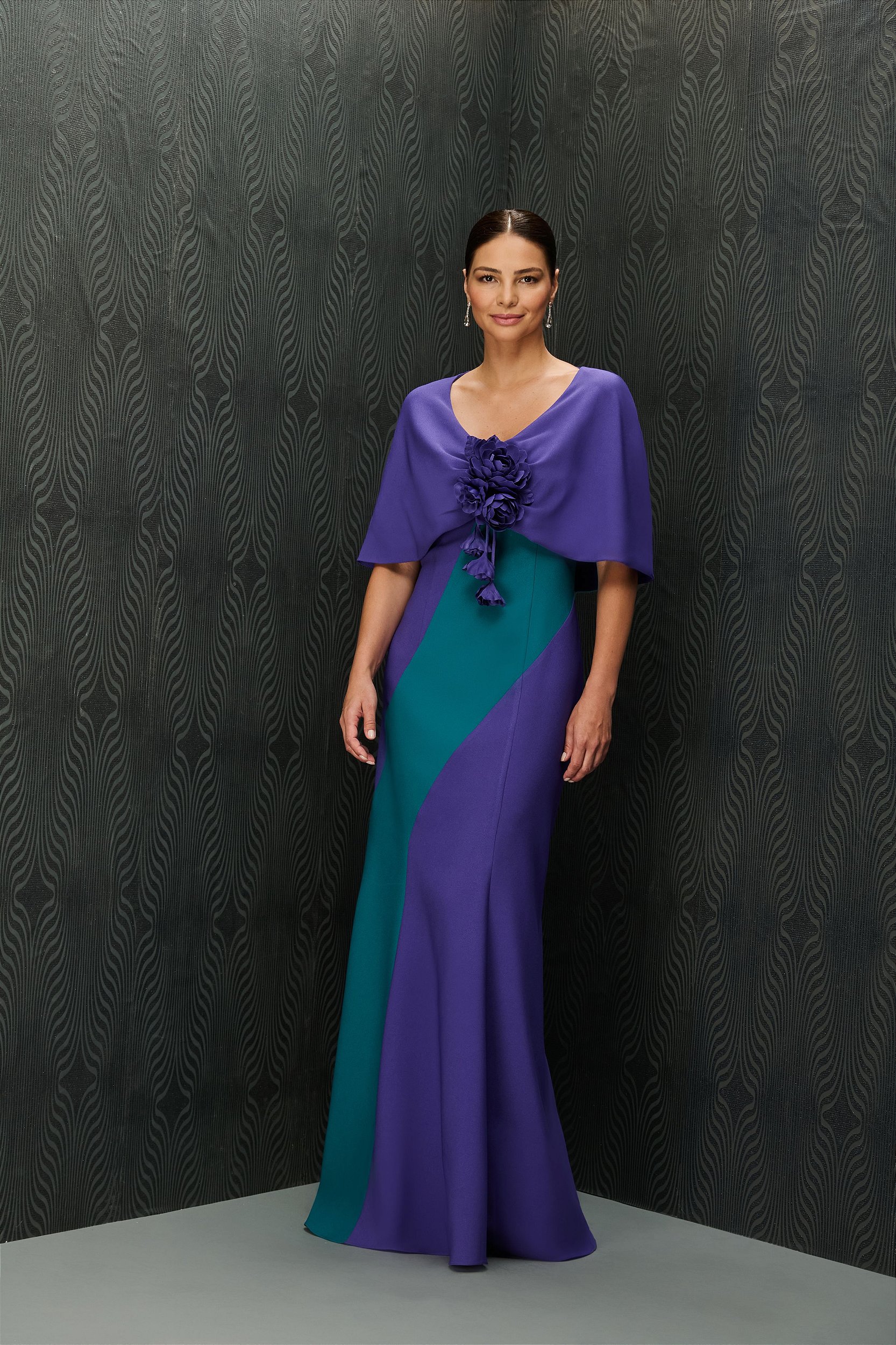 Vestido longo bicolor. Acompanha capa e broche de flor.
